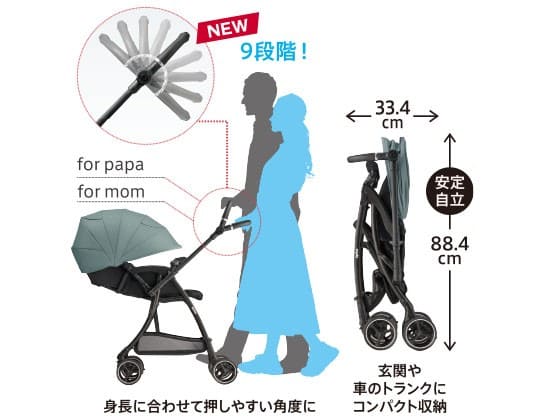 1番のメリットが身長に合わせて押しやすい角度にできることです。(身長差のあるママ・パパさんだと嬉しい機能)